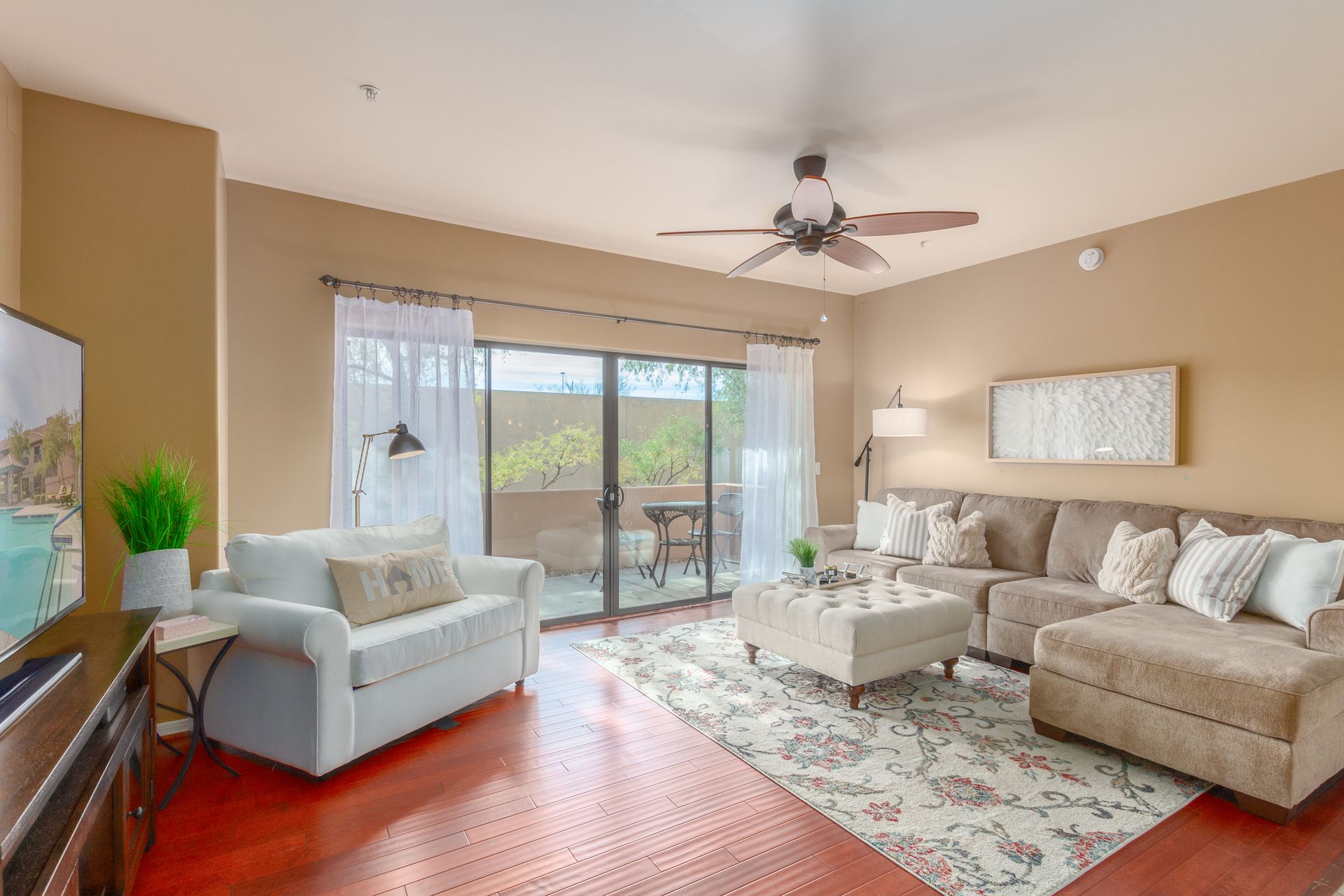 A bedroom with a king size bed , a couch , and a ceiling fan.